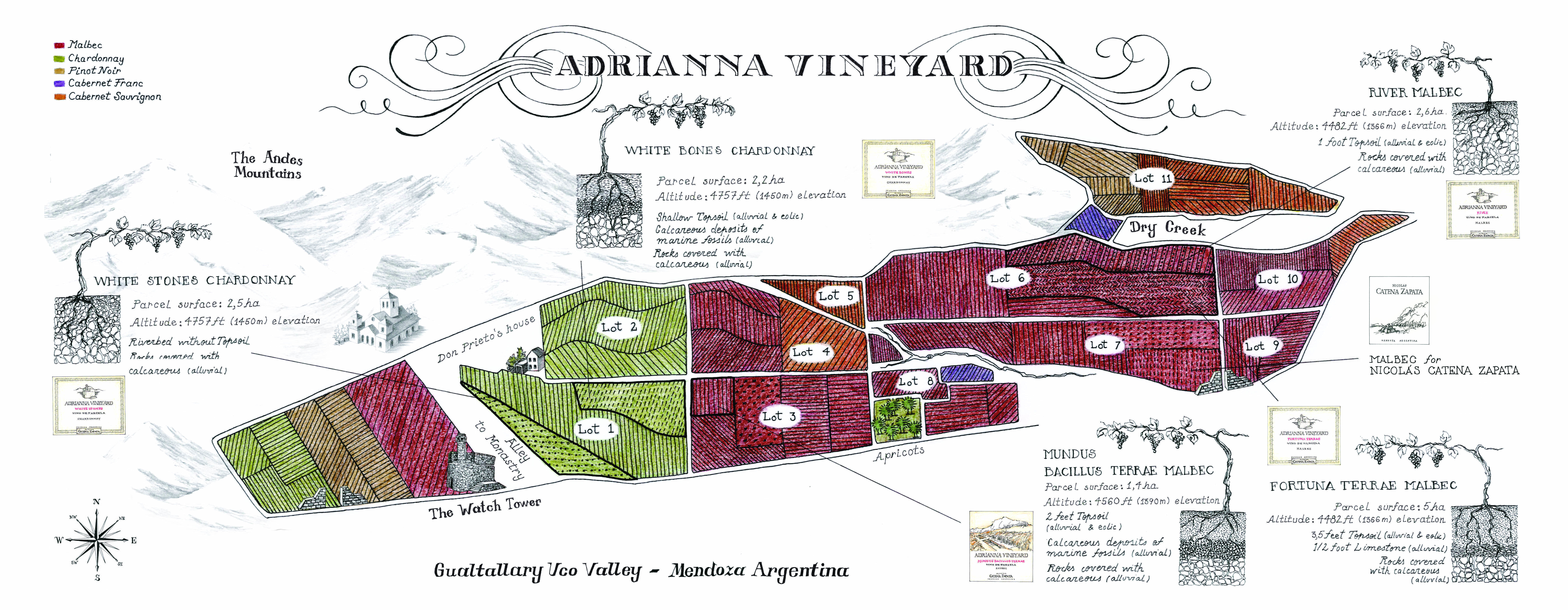 De fameuze Adrianna wijngaard in Gualtallary is wellicht de meest bestudeerde wijngaard ter wereld en is volgens de vele de beste wijngaard van Catena voor malbec. Er lopen nu studies inzake de bodemsamenstelling en de diepte en de invloed op de kwaliteit. Ook wordt het bodemleven bestudeerd waarbij de aandacht uitgaat naar unieke bacteriën die de wateropname zouden bevorderen. De wijngaard is gelegen op een respectabele hoogte van maar liefst 1480 meter. Onder de tab: Bijlage vindt veel informatie en foto's over deze wijn en de wijngaard.