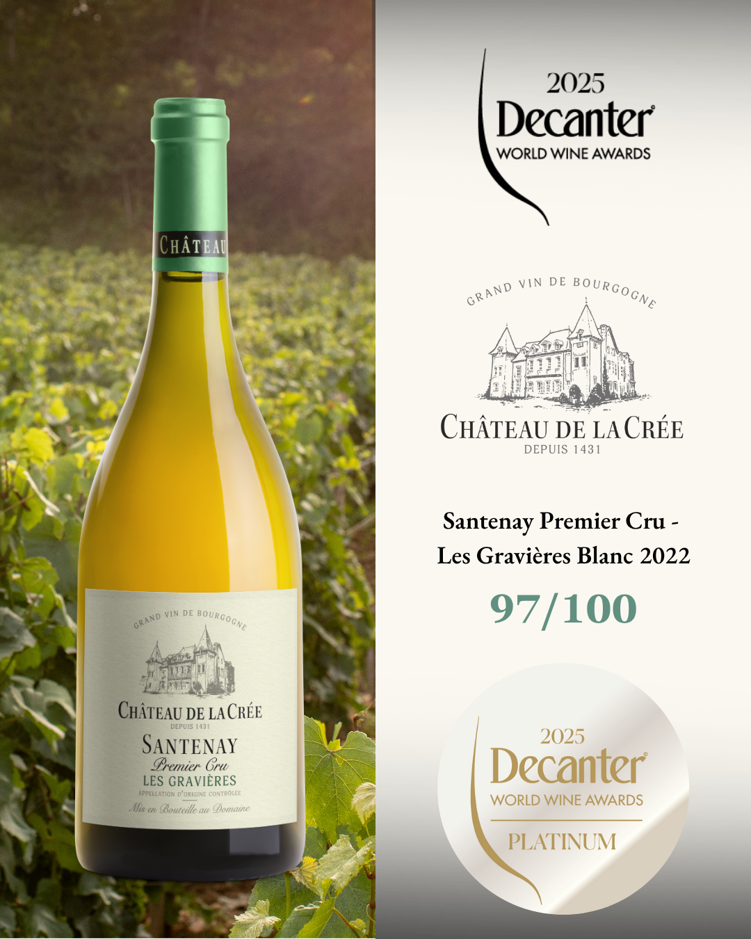 Het eerbiedwaardige landgoed Château de la Crée in Santenay, Bourgondië, dateert uit de 15e eeuw, toen het eigendom was van Nicolas Rolin, kanselier van Filips de Goede en oprichter van de Hospices de Beaune. Tegenwoordig omvatten de wijngaarden van het Château zeven zeldzame Premier Cru-blokken die volledig langs de beroemde Côte d'Or-helling liggen, de thuisbasis van enkele van 's werelds meest legendarische Pinot Noir- en Chardonnay-wijnen. Het landgoed Château de la Crée bestaat uit 25 hectare eersteklas wijngaardblokken in Pommard, Volnay, Meursault, Puligny-Montrachet, Chassagne-Montrachet, Santenay en Maranges en alle aanplantingen zijn gelegen op Premier Cru-sites. In al de wijngaarden worden biodynamische landbouwpraktijken toegepast om een optimale terroirexpressie te stimuleren en de gezondheid van de bodem en de plant te waarborgen.