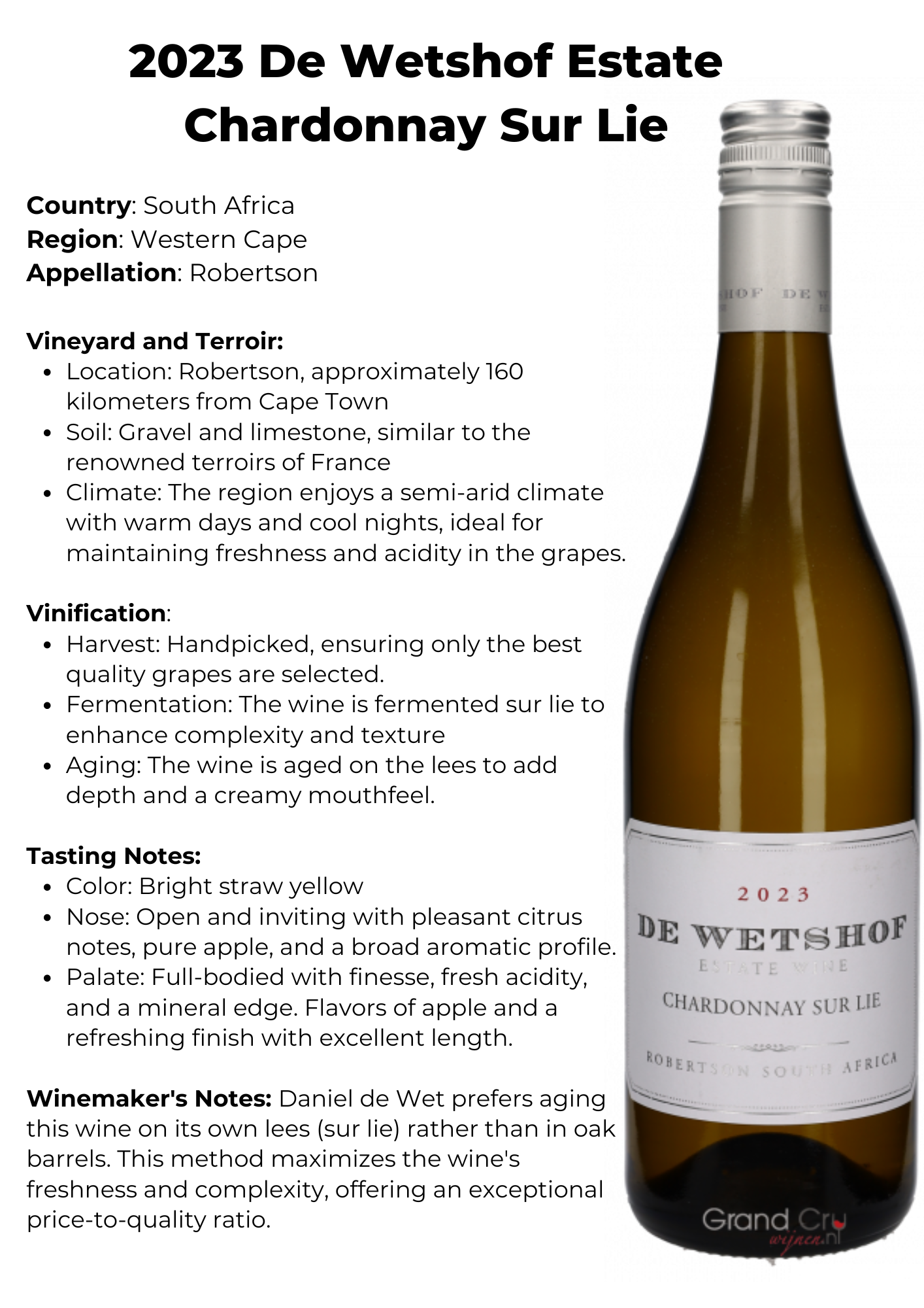 De Wetshof Sur Lie Chardonnay komt van wijngaarden gelegen op een ondergrond van grind en kalk, zoals we die ook in Frankrijk vinden. Ideaal voor mooie Chardonnay. De Wetshof Chardonnay is helder strogeel in het glas met in de neus een mooie open geur met aangename citrustonen, heerlijk puur, appel, breed. In de mond is deze geweldige chardonnay vol met veel finesse en frisse zuren, mineralig en fris, appel en heeft een mooie lengte. Daniel de Wet prefereert om deze wijn op zijn eigen most (sur lie) op te voeden en deze niet op hout op te voeden zodat de wijn de maximale frisheid krijgt en door de sur lie zijn complexiteit. Deze chardonnay heeft een ongekend goede prijs/kwaliteit verhouding