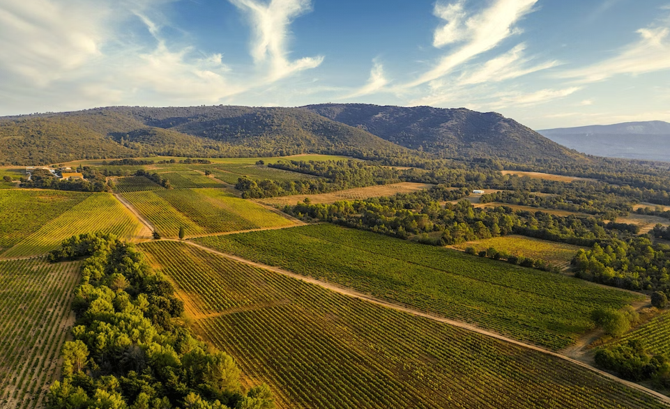 De wijngaarden liggen op een licht aflopend terrein, beschut door een heuvelrug aan de ene zijde en een bos aan de andere kant. De Mistralwind uit het noorden fungeert als een natuurlijke bescherming tegen ziektes, terwijl meer dan 2200 zonuren per jaar zorgen voor een optimale rijping van de druiven. Overdag genieten de druiven van warme mediterrane zon, terwijl de koele nachten bijdragen aan een verfijnde zuurgraad en een perfect uitgebalanceerd rijpingsproces.