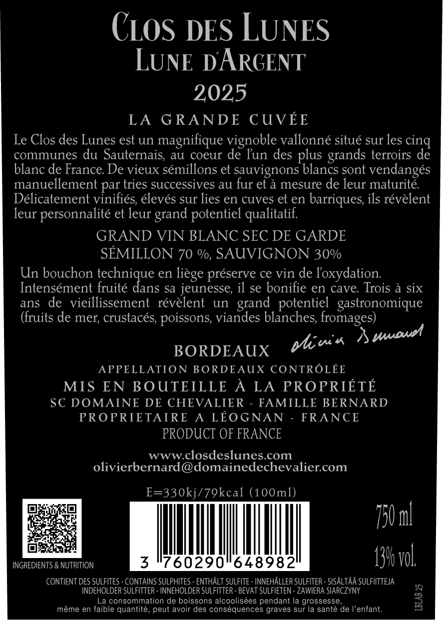 De Familie Bernard (Domaine de Chevalier) maakt ook de CLOS DES LUNES – Lune D’Argent, gemaakt in de appellatie Sauternes. Wij hebben deze wijn zelf mogen proeven en de eerste wijn journalisten hebben dit ook gedaan en dit wordt vermoedelijk een van de beste witte wijn die zijn gemaakt door Domaine de Chevalier en als we geweldige prijs in ogenschouw nemen dan kan dit wel eens de hoogst scorende witte bordeaux worden. 2023 lijkt een uitzonderlijke vintage te worden voor de witte Bordeauxwijnen. Clos Des Lunes is een Bordeaux Blanc (droge wijn) gelegen in de appellations van Sauternes en gemaakt van oude wijnstokken van Sauvignon en Sémillon. Dit is een zeer kwalitatieve witte wijn tegen een zeer betaalbare prijs!