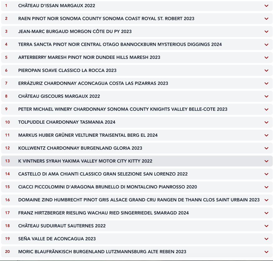 Hoewel sommige iconische flessen extreem duur zijn geworden, blijven er talrijke uitstekende wijnen met een eerlijke prijs. Ongeveer de helft van de Top 100 kost minder dan 100 dollar per fles, en tien wijnen zelfs minder dan 50 dollar.