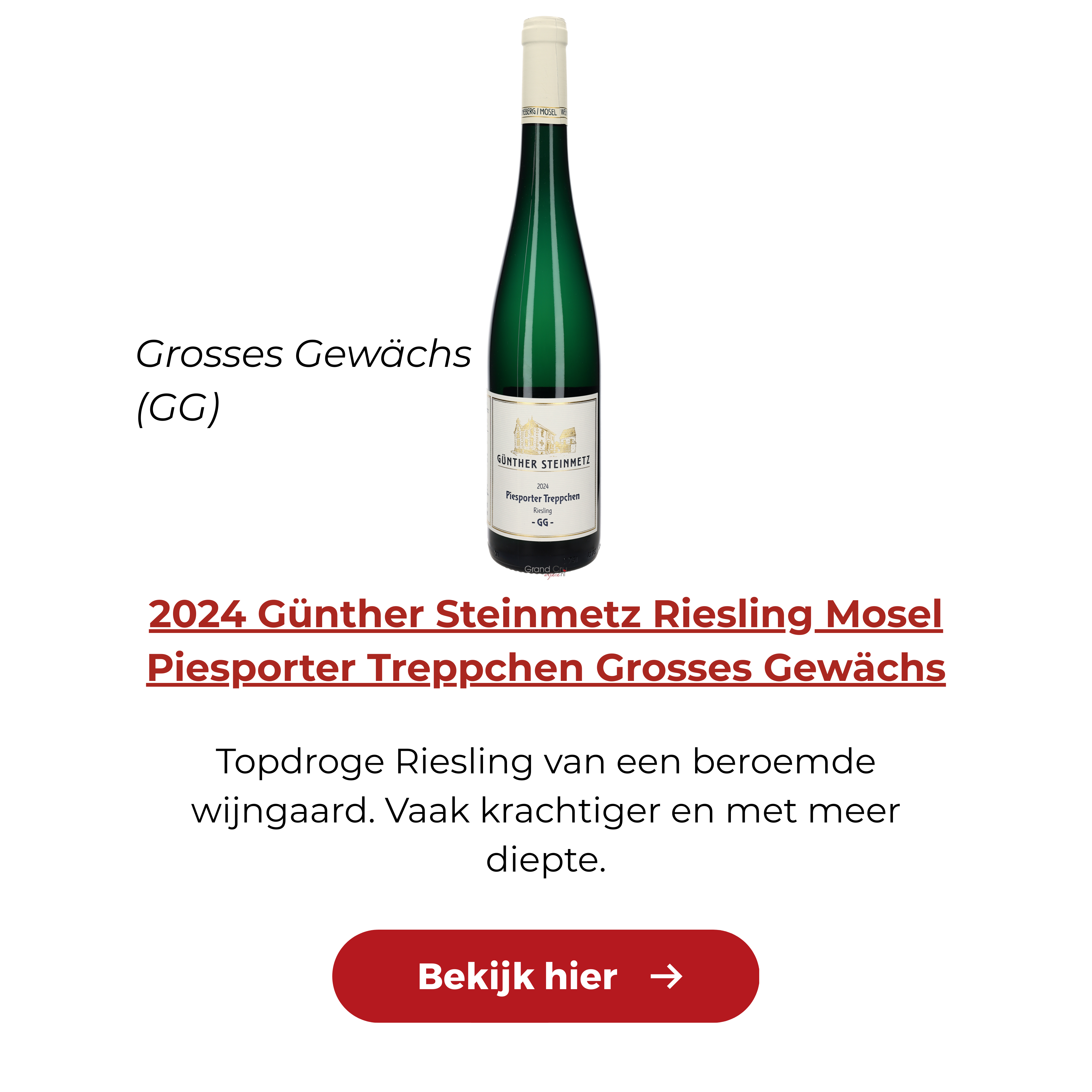 GG staat voor Grosses Gewächs en komt uit het VDP-classificatiesysteem. Dit zijn droge wijnen van topwijngaarden. Ze hebben meestal meer structuur, diepte en vaak ook bewaarpotentieel.