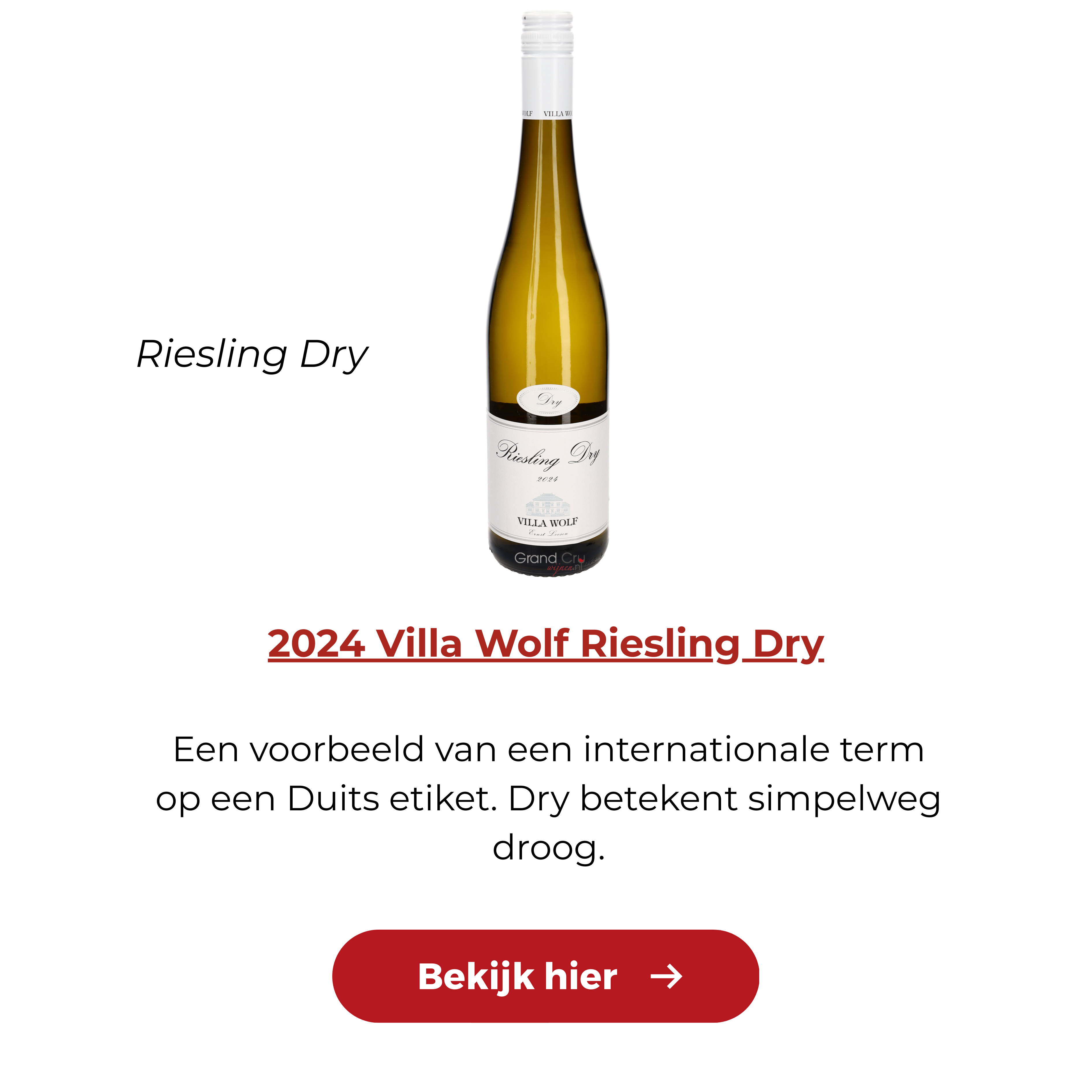 Dit zijn de duidelijkste woorden op een Duits etiket. Zowel Trocken als Dry betekenen simpelweg dat de wijn droog is. Veel producenten gebruiken tegenwoordig ook het internationale woord Dry.