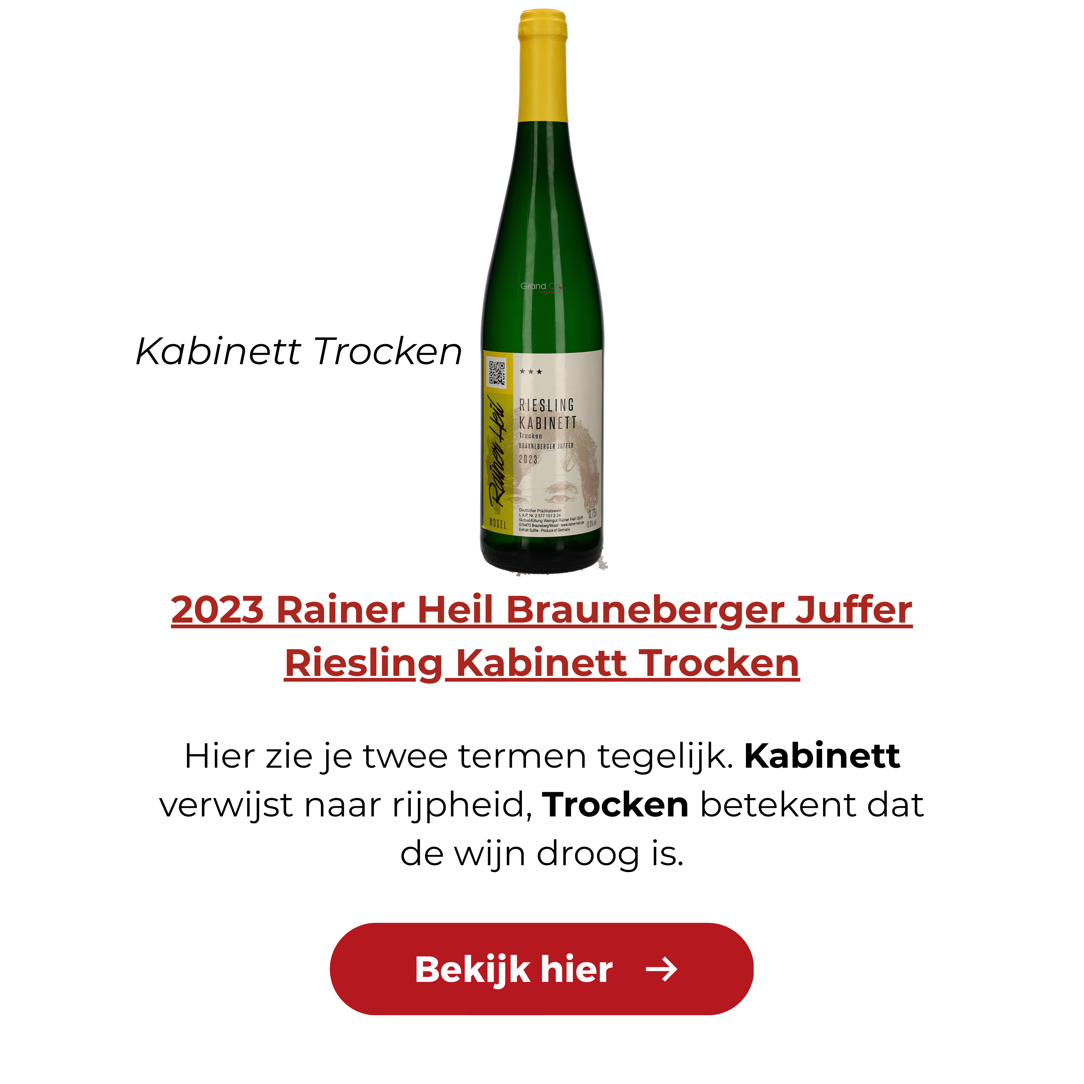 Kabinett verwijst naar het rijpheidsniveau van de druiven. Traditioneel zijn Kabinett-wijnen lichter in alcohol en heel fris. Ze kunnen droog zijn, maar ook een beetje restsuiker hebben. Daarom is het belangrijk om te kijken of er ook Trocken op het etiket staat.