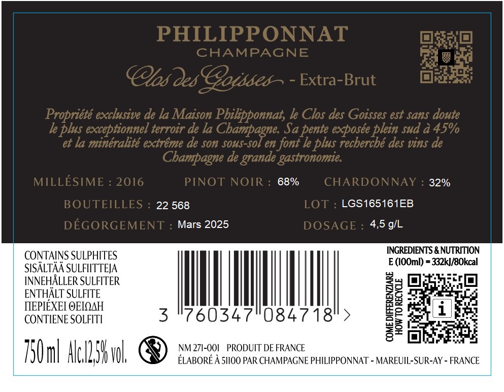 In the glass, the Philipponnat Clos des Goisses has a beautiful golden color with a lovely, persistent ring of very fine bubbles. The nose is initially very fresh and expressive, with notes of yellow fruit, mirabelle plum, and green apple, but with a gentle swirl in the glass, floral notes of vine and acacia blossom are released. The finish has a lightly toasted character. On the palate, this fine champagne is fruit-driven and intense, with an enveloping texture and notes of fresh fruit, honey, and linden. The finish displays a taut minerality and a pleasant salinity. Clos des Goisses is a very fine wine before it becomes a very fine champagne. It is a perfect and unforgettable pairing for strong-flavored dishes. In a few years, it pairs perfectly with fish or lobster and soft cheeses. Bottles often benefit from being decanted. This champagne has matured in the cellar for many years and is only released when it has reached its full maturity, but it can still be kept for decades and will continue to develop beautifully under the right conditions.