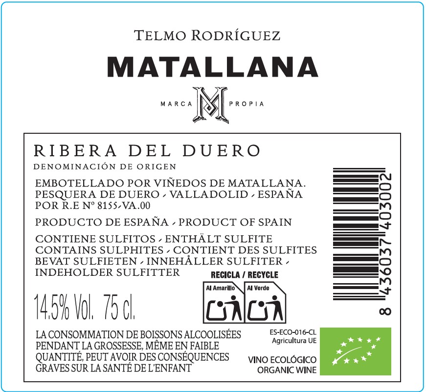 Matallana is Telmo Rodríguez and Pablo Eguzkiza's Ribera del Duero project. Their vision is to restore the region's historical value, focusing on terroir and tradition. Since 1998, old bush vines have been restored and new plots planted using traditional methods. Today, Matallana encompasses eleven vineyards spread across five villages: Sotillo de la Ribera, Roa, Fuentecén, Fuentemolinos, and Pardilla. The total area covers 21.5 hectares, of which 5 hectares contain vines over 50 years old, and 16.5 hectares are newly planted, maintaining a high planting density and adapting naturally to the surrounding environment.