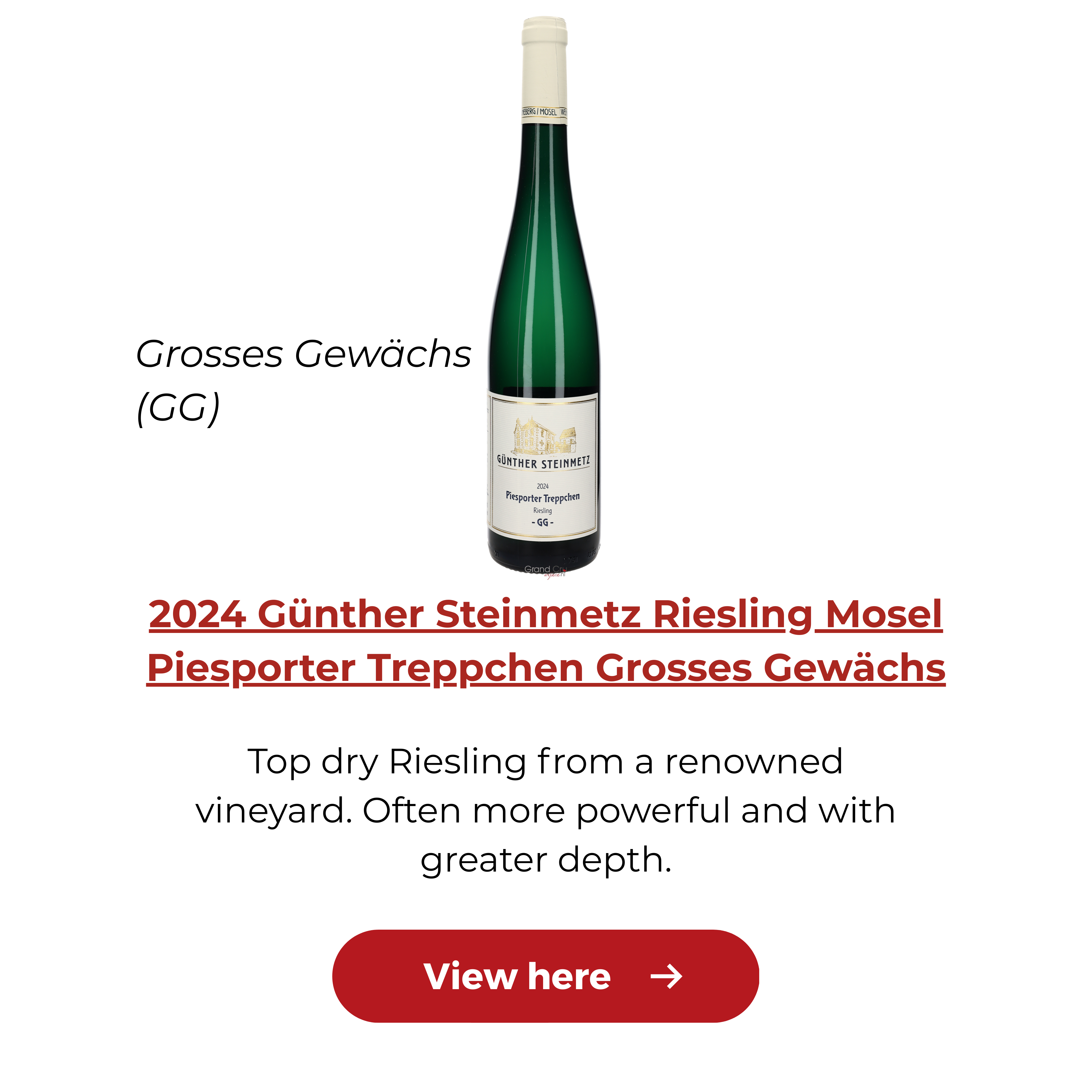 GG stands for Grosses Gewächs and comes from the VDP classification system. These are dry wines from top-classified vineyards. They usually offer more structure, depth and often have good ageing potential.