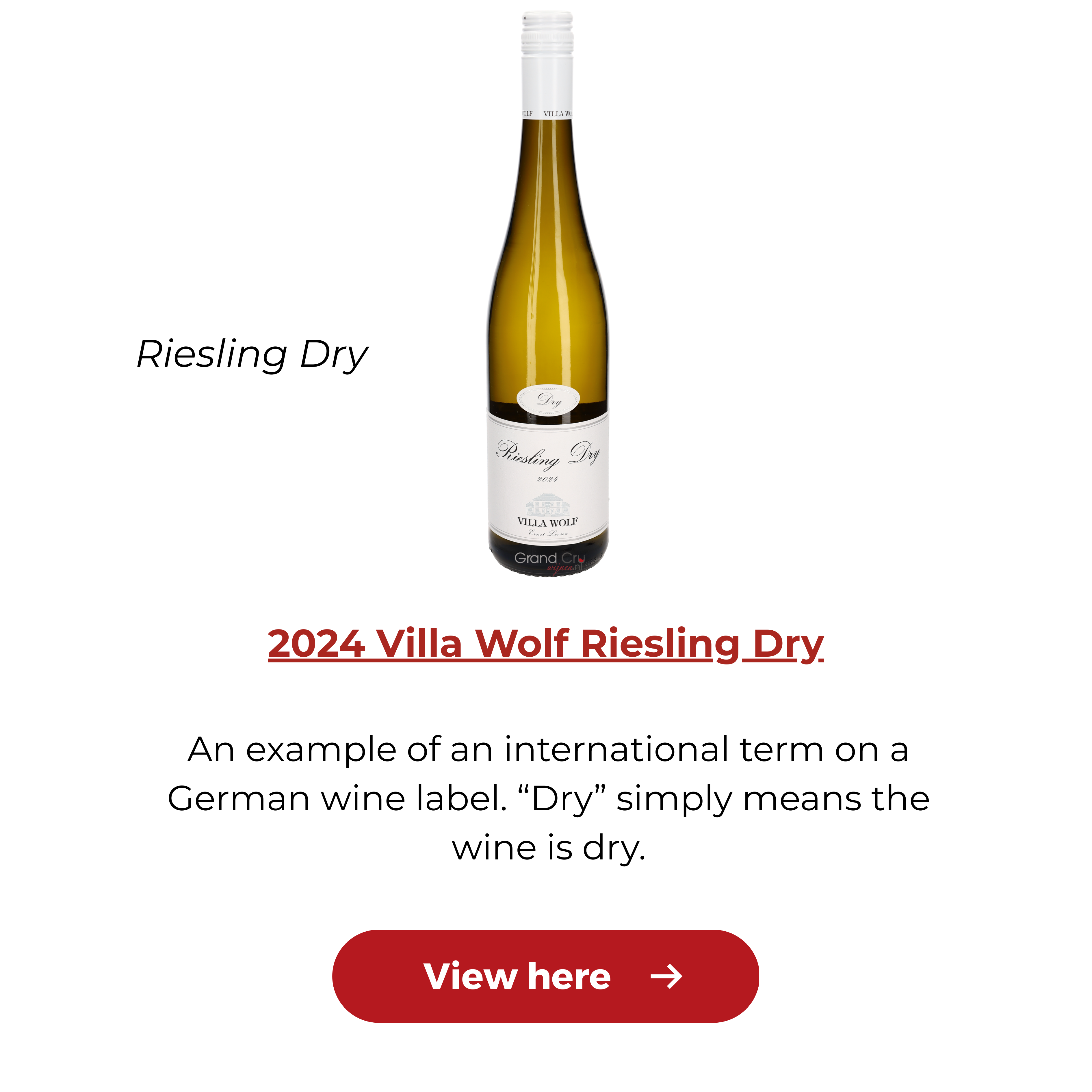 These are the clearest words you can find on a German wine label. Both Trocken and Dry simply mean the wine is dry. Many producers today also use the international term Dry.