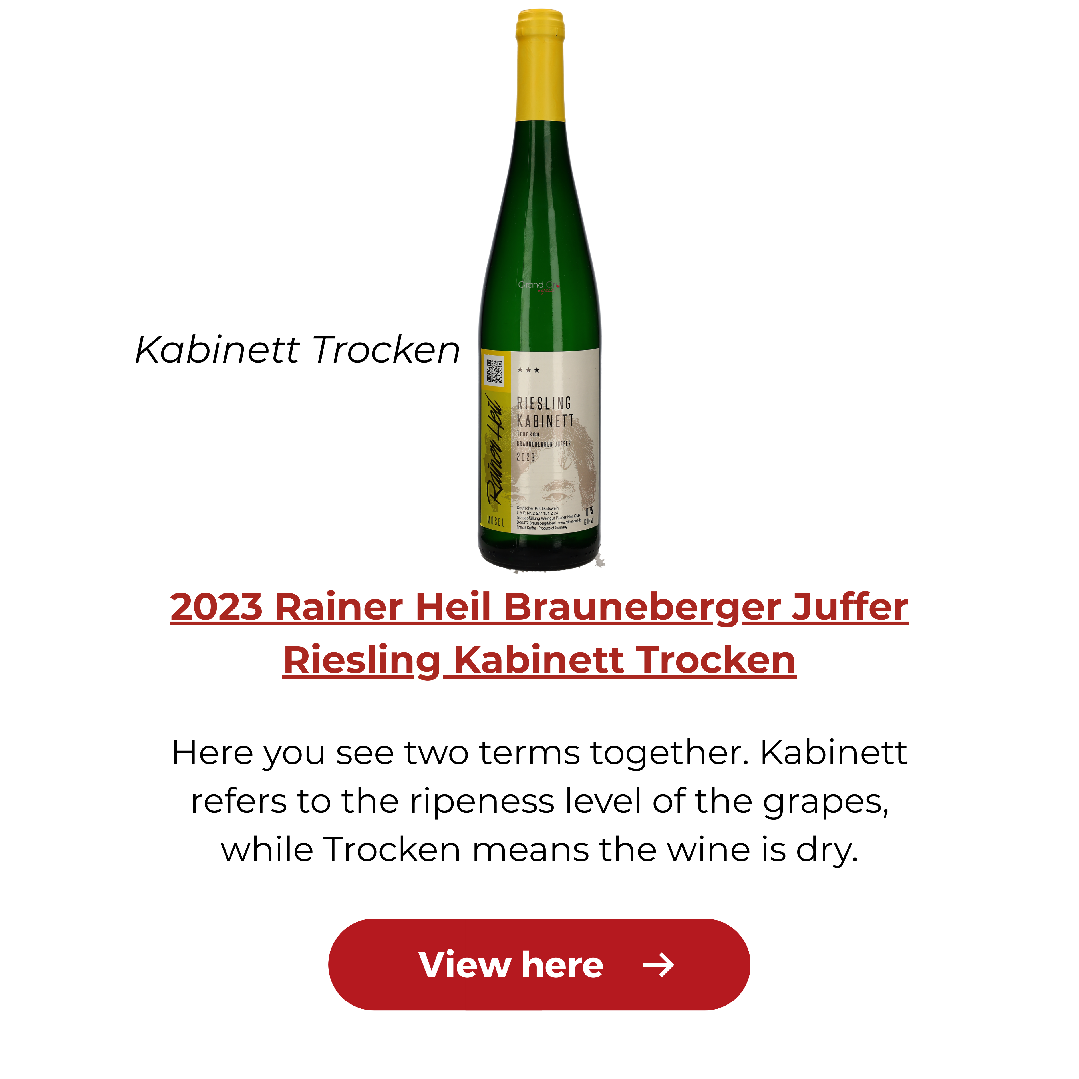 Kabinett refers to the ripeness level of the grapes at harvest. Traditionally, Kabinett wines are lighter in alcohol and very fresh in style. They can be dry, but they may also contain some residual sugar. That is why it is important to check whether the word Trocken also appears on the label.