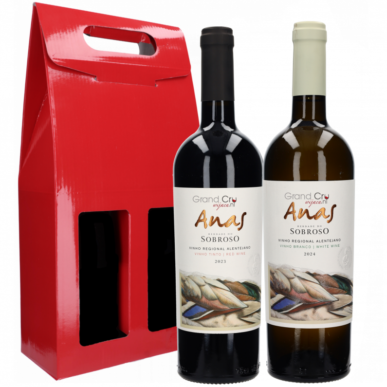 Herdade do Sobros is ranked among Forbes' top wineries. They produce a very fine and affordable quality wine, namely Anas Tinto and Anas Blanco. This wine is presented in a beautiful gift box containing two bottles. Under the "Package Contents" tab, you'll also find more information about the package contents and the individual prices.