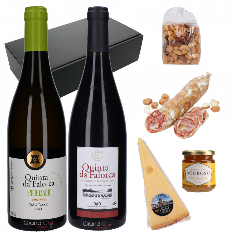 Meld je aanWe hebben een pakket samengesteld met een aantal heerlijke wijnen en Grandcru-waardige delicatessen. In het tabje pakketinhoud vindt u ook meer informatie over de inhoud van het pakket en de individuele prijzen. Wilt u liever een andere samenstelling dan is dit geen probleem en helpen wij u graag. Dit pakket is een samenstelling met 2 exclusieve wijnen van Falorca uit de cool-climate regio van Portugal: de Dão. Zeer elegante wijnen met een lang bewaar-potentieel en met lovende reviews vanuit de internationale wijnpers zoals o.a. Parker. Natuurlijk wijnen die wij exclusief voeren en geen onbekende white label wijnen van vaak twijfelachtige kwaliteit.