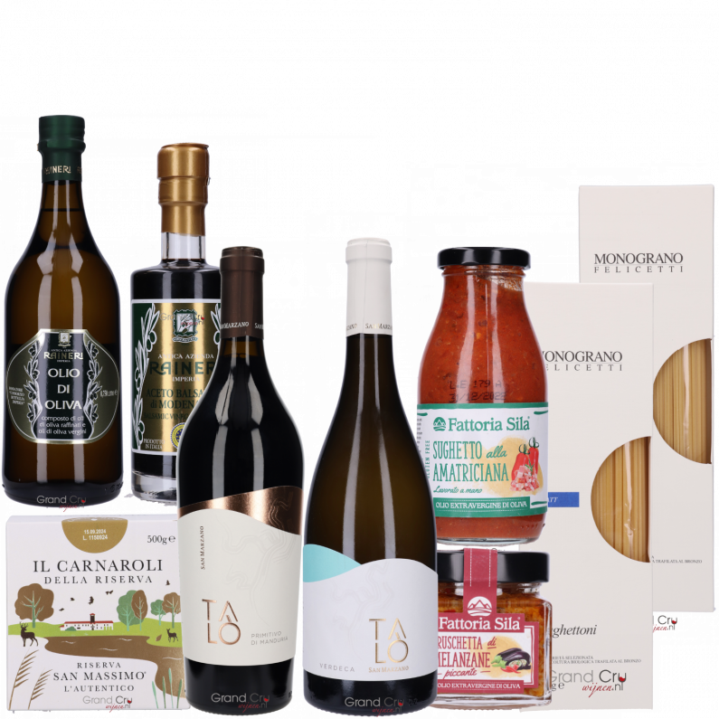 Een prachtig samenstelling van stuk voor stuk fraaie Italiaanse wijnen en delicatessen. Niet de doorsnee supermarkt producten maar producten die alleen maar door de high-end restaurants worden gebruikt. Monograno Pasta gemaakt op 1000 meter in de Dolomieten, de San Massimo Risotto van de michelin-ster kok, saus van Fattoria Sila en de Balsamico en Olijfolie van Raineri Olio. Dit alles aangevuld met 2 prachtige wijnen uit de Talò serie van San Marzano.